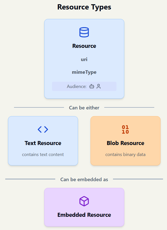 ```typescript interface Resource { ---- Resource and EmbeddedResource // What is it? uri: "search://papers/quantum-2024/results" // How do I handle it? mimeType: "application/json" // Who is it for? audience?: ["assistant"] | ["user"] | ["user", "assistant"] ---- Resource Only // How should I show it? name: "2024 Quantum Theory.json" // How should I describe it to the Assistant? description: "This is the JSON results associated with the 2024 Quantum Theory Results" } ```